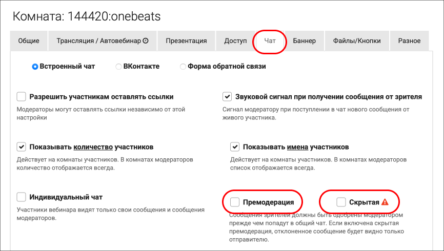 Для включения этой функции, необходимо перейти в настройки вебинарной комнаты, далее во кладку "Чат", далее поставить галочки у пунктов "Премодерация" и "Скрытая":