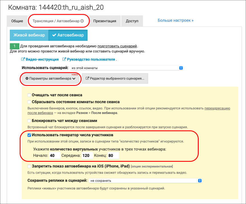 Для надо перейти в настройки вебинара, во вкладку "Трансляция / Автовебинар", далее открыть "Параметры автовебинара", далее поставить галочку у поля "Использовать генератор числа участников".