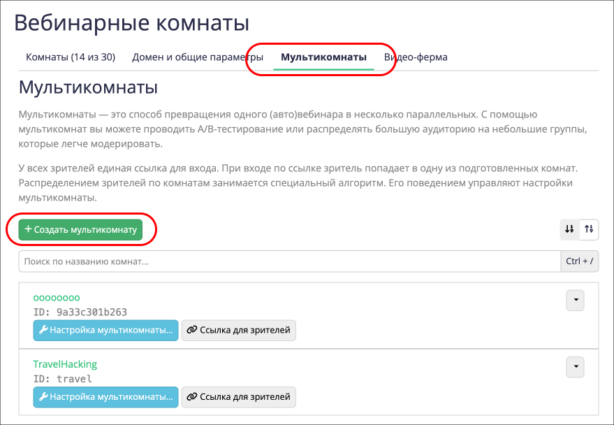 Мультикомната - это превращения одного вебинара в несколько параллельных. Но при этом ссылка на вебинар единая, а система Bizon365 сама делит зрителей пополам.